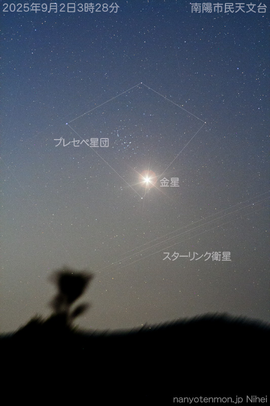 - 二瓶会員です。「2日、明けの明星・金星はかに座を移動中です。甲羅の中のプレセぺ星団に近づきました。おまけでスターリンクの衛星群が写りました。」
