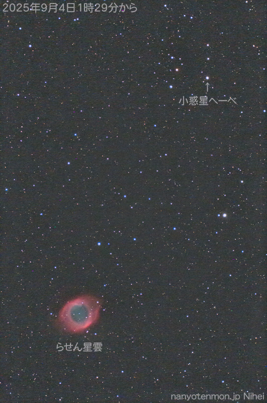 - 二瓶会員です。「6番小惑星ヘーベがみずがめ座のNGC7293の近くを通りました。NGC7293は通称・らせん星雲で知られる大きな惑星状星雲です。」