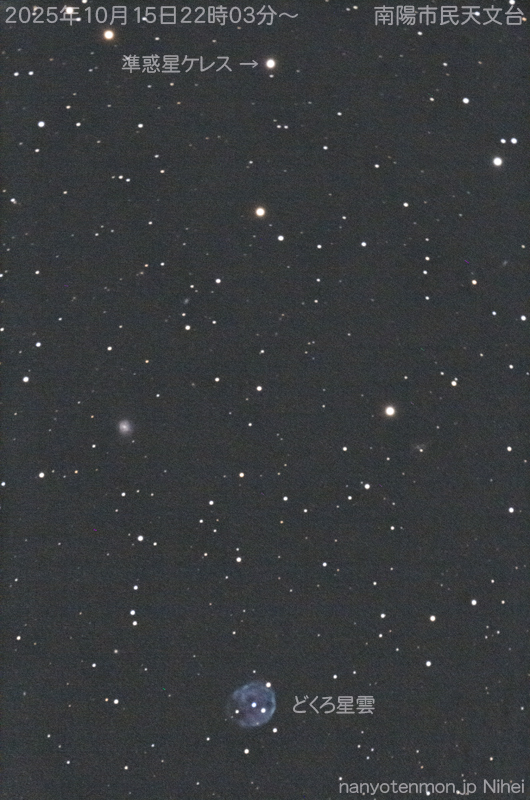 - 二瓶会員 南陽市民天文台 15cm屈折望遠鏡です。「準惑星ケレスがくじら座のNGC246の近くを通りました。NGC246は通称・どくろ星雲で知られる大きな惑星状星雲です。」